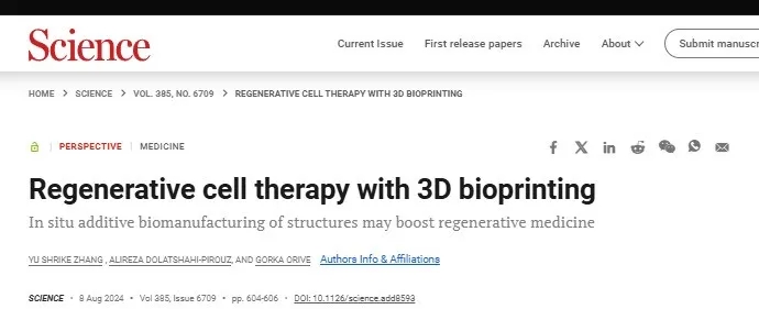 2024年8月8日,哈佛医学院张宇(Yu Shrike Zhang)教授与西班牙的Gorka Orive教授在《Science》上发表了一篇前瞻性论文,探讨了3D生物打印在再生医学中的应用前景。接下来,就让我们一起来深入了解这篇具有前瞻性的文章。