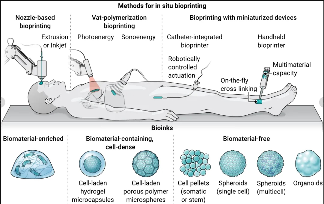 图1:各种原位生物打印方法和生物墨水
