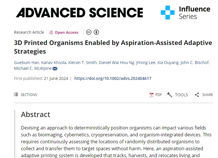 2024年8月21日,明尼苏达大学双城分校的研究人员开发了一种首创的自适应3D打印系统,该系统能够识别随机分布的生物体位置,并安全地将其移动到指定位置进行组装。这项自主技术将为研究人员在生物成像、控制论、低温保存和生物体设备整合等领域节省大量时间和成本。