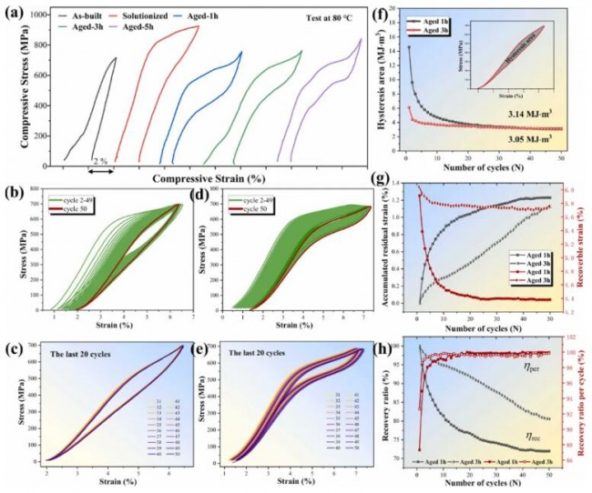 ▲图8 样品在轴向压缩加载下的超弹性测试:(a) 在80°C下对构建完成的、固溶处理的、时效处理的样品进行应力控制的轴向压缩测试;(b) 和 (d) 样品A1和A3的2-50循环加载曲线;(c) 和 (e) 样品A1和A3的最后20个循环压缩曲线;(f) 在50个加载周期中样品A1和A3的滞后面积变化;(g) 在50个周期中样品A1和A3累积的残余应变(ε_res)和每个循环的恢复应变(ε_rec);(h) 每个循环的恢复比率(ε_per)和相对于初始状态的恢复比率(ε_rec)随循环次数的变化。