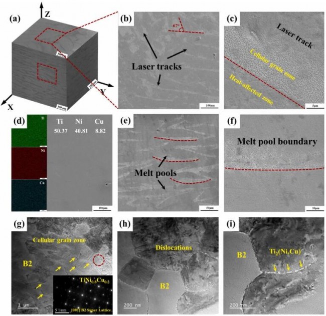 ▲图5 构建完成的NiTiCu合金的微观结构。(a) 三维光学图像,(b) 和 (c) 构建完成后合金表面垂直于构建方向的SEM图像,经过腐蚀处理以及熔道周围不同区域的形态,(d) 与构建方向平行的表面SEM图像和相应的Ti、Ni、Cu元素的EDS映射,(e) 和 (f) 与构建方向平行的表面的熔池形态和熔池边界,(g)-(i) 典型的透射电子显微镜(TEM)图像和相应的选区衍射(SAED)模式,包括B2基体的细胞状晶粒区、亚晶界处的位错和沉淀物。