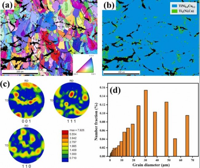 ▲图6 (a) LPBF制造的NiTiCu合金的EBSD取向图和 (b) 不同相的相应分布;(c) 极图和 (d) 构建完成样品的晶粒尺寸分布。