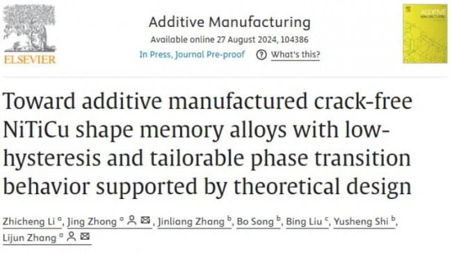 中南大学张利军Add. Manufact.基于理论设计的低滞后、可定制相变行为的增材制造无裂纹NiTiCu形状记忆合金研究