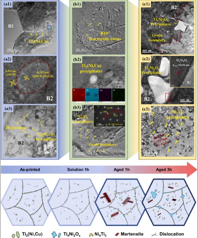 ▲图9 通过透射电子显微镜(TEM)捕获的特征微观结构和在不同热处理过程中微观结构演变的示意图。(a1)-(a3) 构建完成的NiTiCu形状记忆合金的形态的明场图像和B2基体与Ti2(Ni, Cu)沉淀物之间界面的高分辨透射电子显微镜(HRTEM)图像;(b1)-(b3) 样品A1的形态,包括马氏体孪晶、Ti2(Ni, Cu)沉淀物和基体中Ni4Ti3沉淀物的分布;(c1)-(c3) 样品A3中沉淀物的形态和相应圆形区域的HRTEM图像。