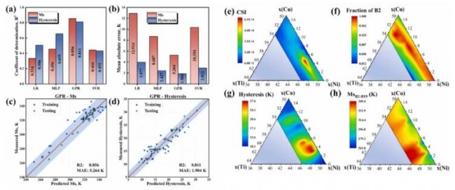 ▲图3 基于CALPHAD和机器学习(ML)计算结果,对NiTiCu合金优化组成区域的ML模型评估和彩色图谱。不同ML模型在Ms温度和热滞后替代建模方面的性能比较,包括 (a) 决定系数(即R²分数)和 (b) 平均绝对误差(MAE, K)。通过GPR模型预测的Ms温度和热滞后的真值数据与预测数据点对比图,分别为 (c) Ms温度和 (d) 热滞后预测。(注意:较高的R²分数表示更好的性能,而较低的MAE值也表示更好的性能。)彩色图谱包括 (e) 裂纹敏感性指数(CSI)值;(f) 凝固结束时B2相分数;(g) 整个马氏体相变的预测热滞后;以及 (h) B2至B19相变预测的Ms温度。