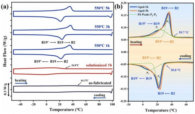 ▲图7 (a) LPBF制造的NiTiCu合金的温度依赖性DSC响应,1000°C固溶处理1小时的样品,以及在550°C下时效处理1小时、3小时和5小时的样品;(b) 在550°C下时效处理1小时和3小时的样品的局部放大图像和峰值拟合结果。