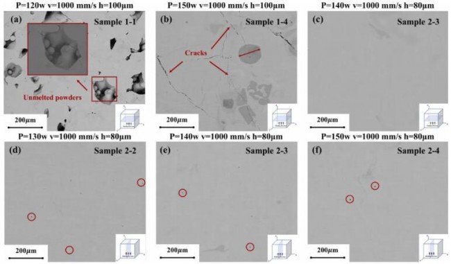 ▲图4 不同工艺参数下通过LPBF工艺制造的NiTiCu合金的代表性扫描电子显微镜(SEM)图像:(a)-(c) 与建筑方向平行,而 (d)-(f) 垂直于建筑方向,扫描速度为1000毫米/秒。(a)-(c) 中的箭头显示未熔化的粉末,而 (d)-(f) 中的圆圈指示小孔。