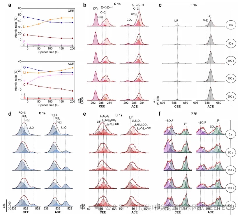 图4:SEI化学成分。循环LMA的XPS表征。(a)使用CEE和ACE在不同溅射时间下的原子组成比。(b)