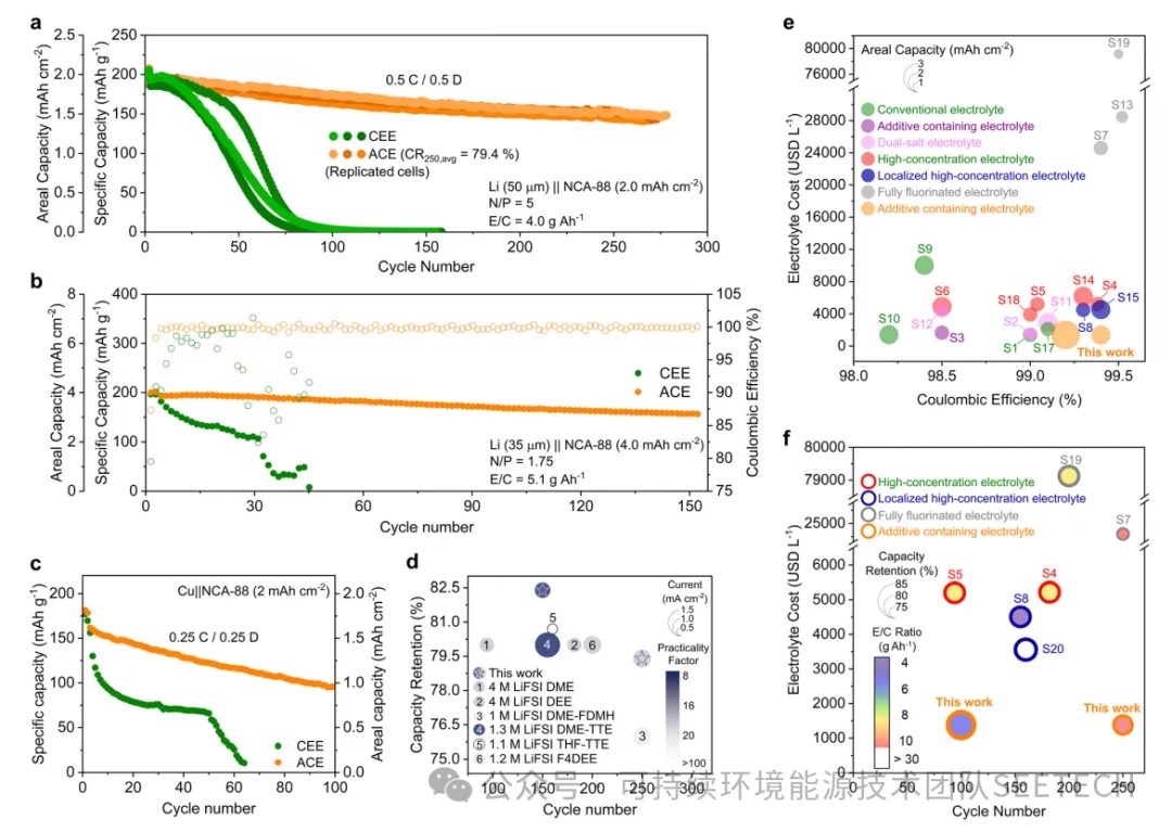 条件:50µm LMA与2 mAh cm-2 NCA88阴极配对,N/P比5.0,E/C比4.0 g Ah-1。电池在0.5 C充放电循环。(b) Li| NCA88电池在实际条件下的循环性能。条件:35µm LMA与4 mAh cm-2 NCA88阴极配对,N/P比1.75,E/C比5.1 g Ah-1。电池在0.1 C充电和1/3 C放电时循环。(c)无阳极Cu| NCA-88电池的循环性能。条件:铜与2 mAh cm-2阴极配对,E/C比为4.0 g Ah-1。(d) LMB与其他乙醚电解质的循环次数、循环保持率、电流密度和实用系数的比较。实用性因子定义为市盈率和市盈率的乘积。(e) Li| Cu的库仑效率和各自的面容量的比较;(f)不同电解质设计策略下Li| Cu的4-V级阴极循环次数、容量保持率和E /C比与电解质成本的关系。