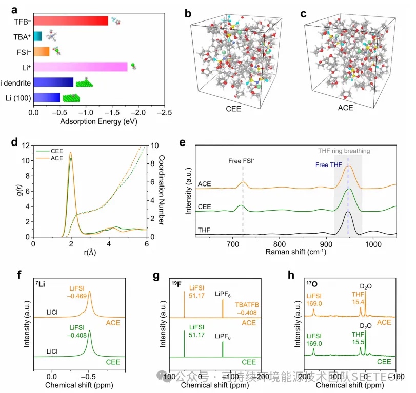 CEE和(c) ACE以及(d)它们对应的Li+径向分布函数的MD模拟快照。(e)纯THF、CEE和ACE得到的拉曼光谱。(f)