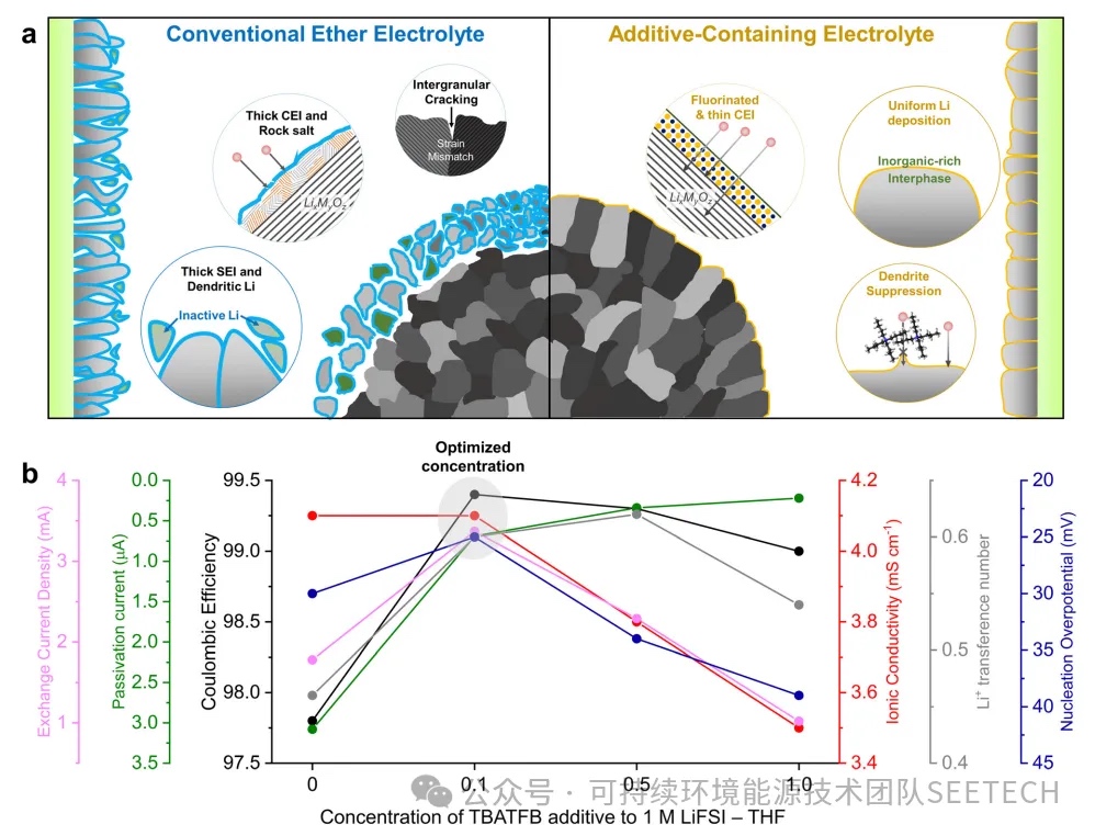 锂的可逆性通过在铜衬底上镀锂剥离工艺进行评估,电流密度1 mA cm-2,面容量为1 mAh cm-2,循环300次。TBATFB的加入增强了LMA的稳定性,证明了库仑效率(CEs)超过99%,而在醚电解质中观察到的效率为97.8%。当使用改进的Aurbach方案测试电解质时,这一趋势保持一致,值得注意的是,直到第50个循环,1M LiFSI + 1M TBATFB在THF中的CEs逐渐增加归因于高盐浓度,这一趋势与3M LiFSI高浓度电解质平行。在1 mA cm-2时,添加0.1M TBATFB的电解质显示出最低的初始Li成核过电位,为25 mV。较低的成核过电位是有利的,因为它在热力学上有利于形成较大的锂核,从而导致致密的锂沉积形态我们进一步分析了这些电解质体系的离子电导率和锂选择性。TBATFB的加入一般会导致离子电导率降低,但在0.1M TBATFB时,离子电导率的变化与醚电解质相比可以忽略不计。电解质粘度随着TBATFB浓度的增加而增加,表明电解质内离子迁移率降低。加入TBATFB后,观察到Li+转移数增加,这是由于TBA+阳离子与FSI -和BF4 -阴离子之间的吸引库仑相互作用增强了阳离子的选择性接下来,我们通过测量Li| Cu不对称电池在0 V与Li/Li+下的泄漏电流来评估Li钝化稳定性。低泄漏电流(低于1µA)强调了由于TBATFB添加剂增加的SEI稳定性。使用两种方法测量电解质的交换电流密度:外推Tafel图和在低过电位下应用Butler-Volmer方程,两者均显示平行趋势。在两种方法中,与乙醚电解质相比,0.1M和0.5M TBATFB添加剂表现出更高的电化学活性。为了优化添加剂工程电解质,我们比较了不同添加剂浓度下的关键参数,包括交换电流密度、钝化稳定性、CE、离子电导率、转移数和成核过电位(图1b)。分析表明,THF中的1M LiFSI + 0.1M TBATFB代表了优化的电解质体系