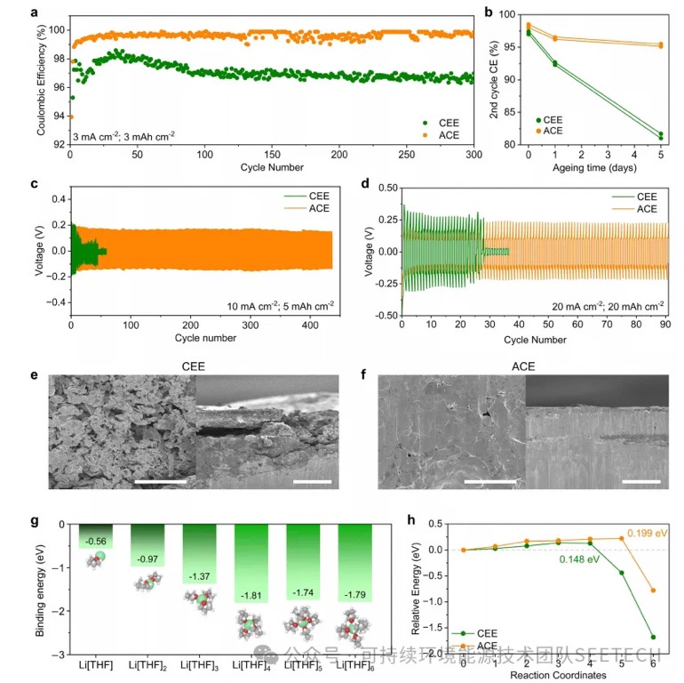 CEE和ACE的平均CEs分别为97.0%和99.2%。CEE的CEs随老化时间呈相对线性下降,而ACE的容量损失趋于稳定,表明其具有自钝化行为。为了评估LMA稳定性,Li||Li对称电池在高电流密度和10 mA cm-2和4 mAh cm-2(图3c)以及20 mA cm-2和20 mAh cm-2(图3d)下进行了测试。在这两种条件下,细胞在循环初期CEE均出现短时循环,而ACE则表现出稳定且延长的循环性能。ACE在1 mA cm-2和1 mAh cm-2的较温和的状态下也表现出了1000次的稳定循环稳定性。为了破译潜在的失效机制,Li||Li对称电池在1 mA cm-2和1 mAh cm-2下循环100次并进行分析。扫描电镜(SEM)图像显示,CEE中有苔藓状和枝晶状的多孔锂沉积,与ACE中无枝晶密集堆积的形貌形成对比(图3e和3f)。电化学阻抗谱显示,在CEE中阻抗从77显著增加到141 Ω。相反,ACE在75 ~ 95 Ω之间表现出适度的增加,表明形成了一个薄而坚固的sei通过测量溶剂化Li+离子沉积在LMA表面时的势能。DFT计算显示,在每Li+ 1到6个THF分子中,Li[THF]4 + (-1.81 eV)是最可能的溶剂化结构(图3g)。CEE的势能势垒为0.148 eV,可归因于Li沉积时THF分子的脱溶剂(图3h)。最终反应坐标处势能的急剧下降表明热力学上有利于锂沉积。另一方面,微推弹性带(NEB)计算显示,ACE中Li+的能垒增加了约0.199 eV,这表明TBA+正离子层到了屏蔽作用通常情况下,由于先前存在的枝晶上电场浓度的增加,Li+离子的三维扩散促进了枝晶的生长,这种现象通常被称为“尖端效应”由于TBA+阳离子倾向于在三维突起附近积聚,ACE中能量势垒的增加限制了枝晶上Li+的通量,有效地减缓了枝晶的生长,促进了均匀致密的Li沉积。