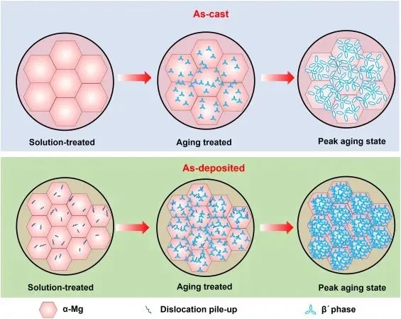 这项研究系统地比较了铸造和 WAAM 成形的 GW93K 合金之间的差异。结果表明,WAAM 成形的合金具有更高的抗拉强度和伸长率。通过比较两组合金在峰值时效状态下的组织结构,发现除了晶粒细化外,沉积过程中形成的位错堆积诱导了细小均匀的稀土强化相高密度析出,这是 WAAM 样品具有高性能的重要原因。通过对比沉积态合金在不同时效状态下的析出行为发现,在过时效状态下,那些亚稳的β′ 相之间的交界处会形成新的析出相 βM。