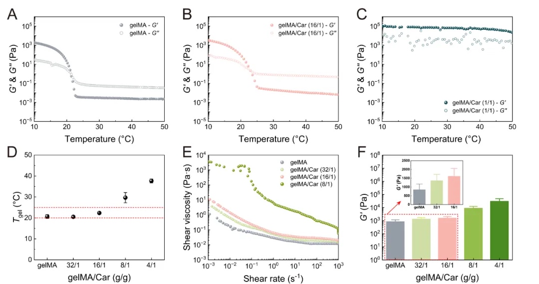 图2. 不同gelMA/Car共混比的双组分水凝胶墨水的流变学行为。