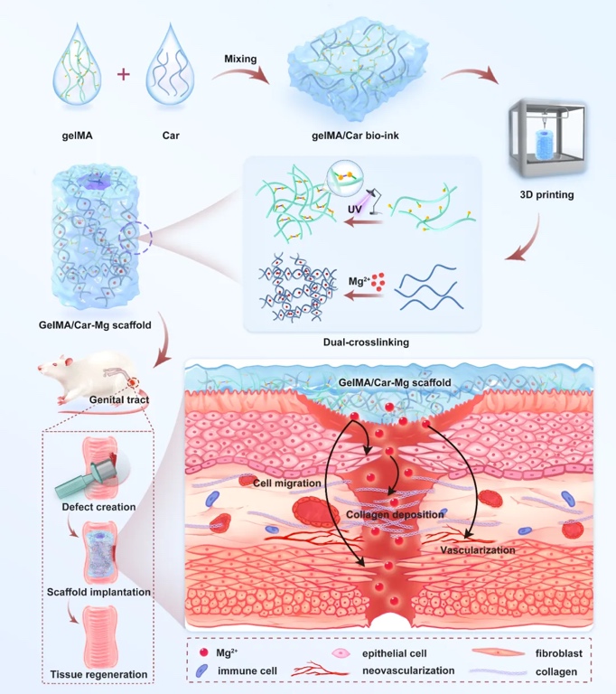 图1.双交联的生物活性GelMA/Car-Mg水凝胶支架的制备及其在生殖道缺损修复中的应用。