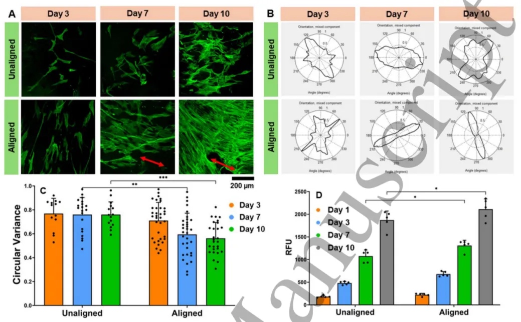 (3)以Col:XG比例为4:1的油墨、SMP浓度为0.4 mg/ml,调节打印流速条件(2mm /s),提高了胶原蛋白支架的打印保真度,同时保持了高水平的胶原蛋白各向异性。细胞研究显示hMSCs在排列的胶原蛋白支架上均匀定向。更重要的是,胶原蛋白各向异性被发现可触发hMSCs的肌腱或韧带样分化。总体而言,4D打印是一种可行的策略来产生各向异性胶原蛋白支架,在肌肉骨骼组织工程应用中具有巨大的潜力。