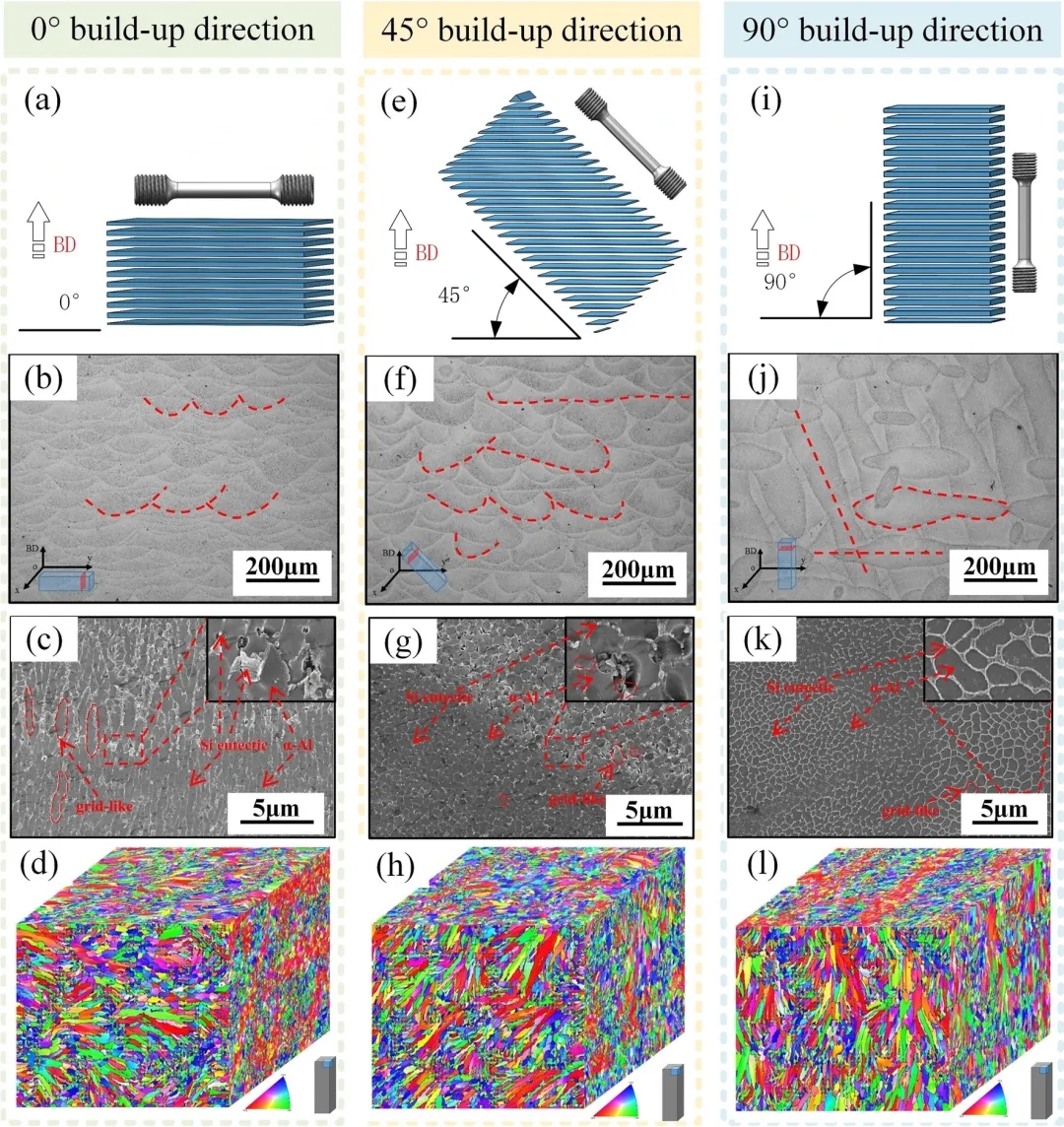 图4.LPBF成形后AlSi10Mg的三维示意图、OM、SEM 和 EBSD 逆极图(IPF)a成形0°、b 成形45°、c成形90°。