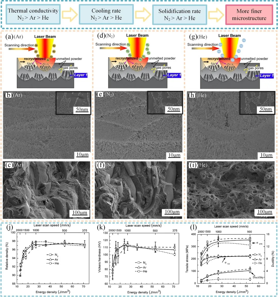 图5.a-c Ar、d-f N2、g-i He下制造的Al-12Si样品的OM图像和断口形貌。j-l不同气氛下制造的Al-12Si样品的相对密度、硬度和拉伸性能。
