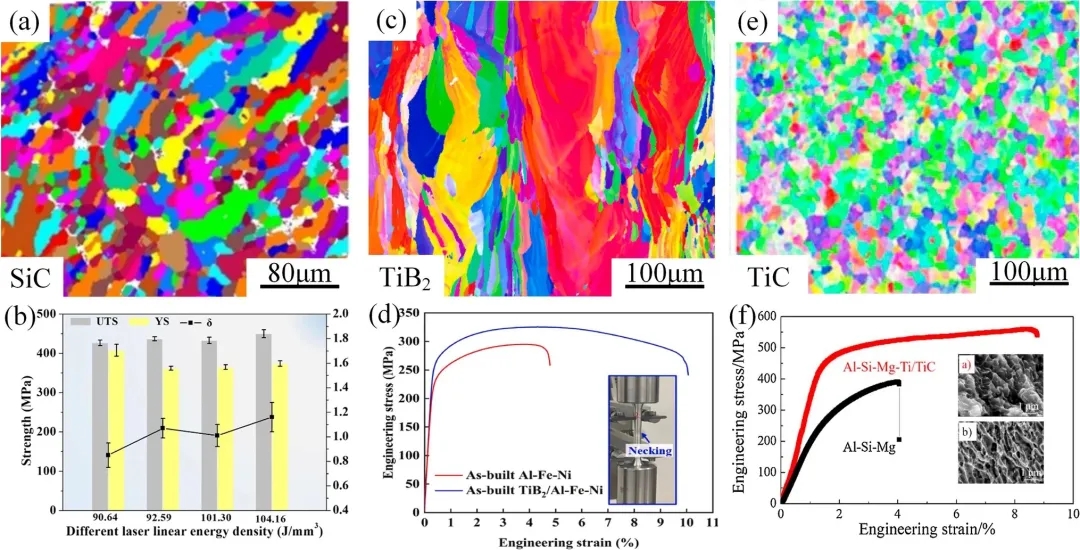 图8.LPBF制备的a,b AlSi10Mg/10SiC;c, d Al-Fe-Ni/TiB2;e, f Al-Si-Mg-Ti/TiC的晶粒形貌和力学性能。