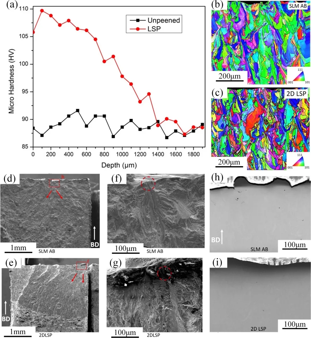 图9.a经过喷丸强化处理和未经过喷丸强化处理样品的维氏硬度曲线。b,c经过喷丸强化处理和未经过强化处理样品的EBSD横向椭圆极图。d-g经过喷丸强化处理和未经过喷丸强化处理样品断裂表面的横截面图。h, i经过喷丸强化处理和未经过喷丸强化处理样品的 SEM图像。