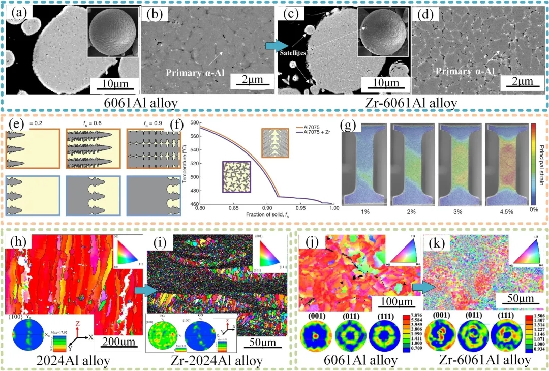 图7.a-d Zr改性前后的AA6061粉末;凝固示意图;f添加Zr前后AA7075铝合金的凝固行为;g Zr改性后AA7075的应变行为。h AA2024、i Zr-AA2024、j AA6061、k Zr-AA6061的 EBSD取向图和相应的极图。