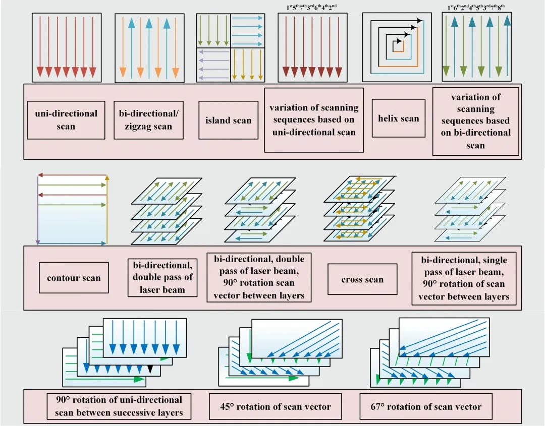 图3.LPBF使用的不同扫描策略示意图。