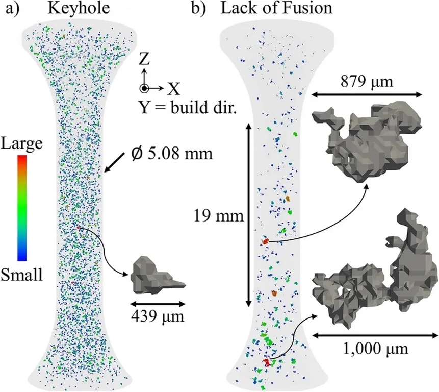 图8使用计算机断层扫描技术在Inconel 718增材制造试样中检测到的一个锁孔和两个缺乏熔合孔缺陷的实例。图中放大了一个锁孔和两个最大的缺乏熔合孔,突出后者的不规则形态。