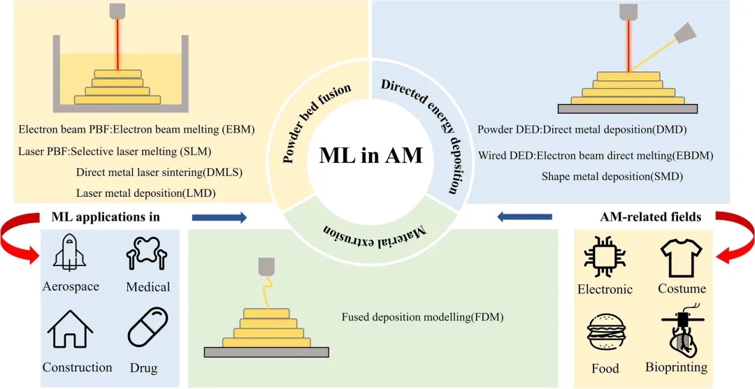 图2 AM中三种常见工艺设备的概述以及常用术语。底部的两张图片说明了从航空航天到生物打印的各种应用,强调了将ML与先进制造相结合的广泛影响。