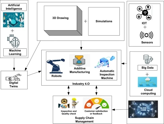 图1使用机器学习、物联网、大数据、数字孪生和区块链技术的增材制造解决方案的系统。