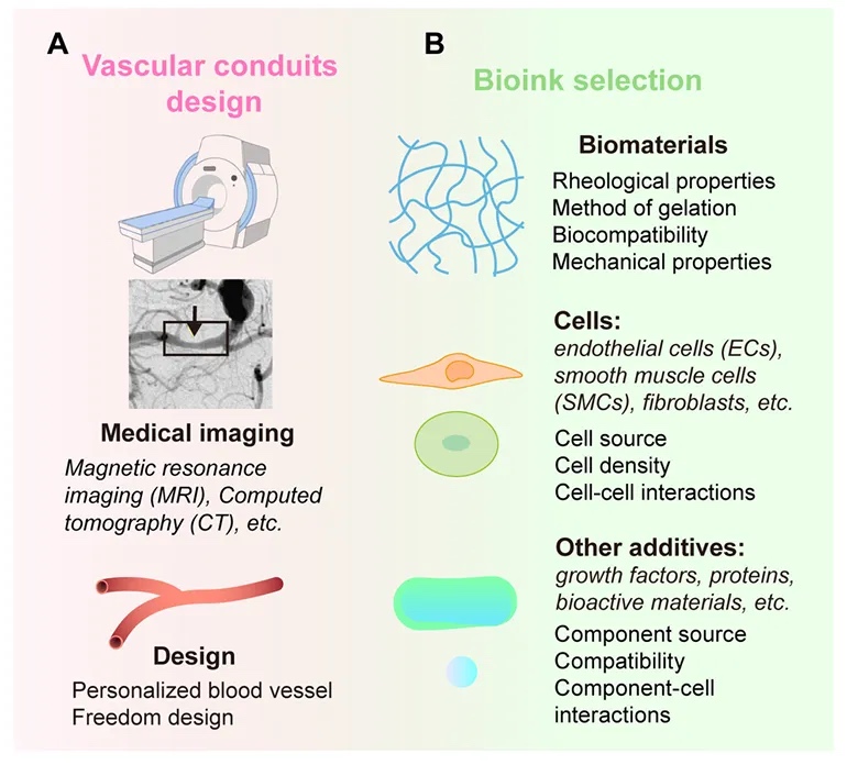 首先,通过使用MRI、CT和其他医学成像技术,可以获得血管网络和细胞的结构、尺寸和空间排列的详细信息,这对于设计患者特异性的血管通道至关重要。其次,选择适合生物打印的生物墨水,这些生物墨水通常由具有适当流变学和机械特性的水凝胶组成,以确保成功的生物打印。细胞的选择同样重要,例如,可以选择内皮细胞(ECs)、平滑肌细胞(SMCs)和成纤维细胞来准确复制天然血管的结构和功能。此外,生物墨水中的生物活性成分也是确保打印性、结构完整性以及支持细胞生长和功能的必要因素之一。