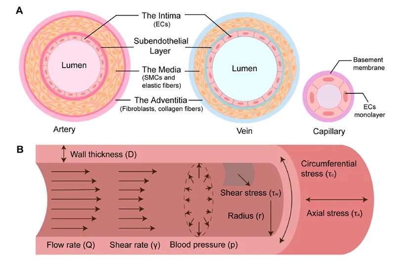 它展示了动脉、静脉和毛细血管的血管壁结构,这些血管壁由三层组成:内膜、中膜和外膜。内膜由内皮细胞(ECs)构成,中膜包含平滑肌细胞(SMCs)和弹性纤维,而外膜主要由胶原纤维构成。此外,还描述了血管所承受的主要机械力量,包括剪切应力、周向应力和轴向应力。剪切应力是血液流动对血管壁的摩擦力,受流量、剪切率、流体粘度和血管腔半径的影响。周向应力是作用在血管壁切线方向上的力,而轴向应力是沿血管纵向轴施加的力。这些力量对血管内皮细胞的功能和血管稳态起着重要的调节作用,剪切应力的变化可能导致内皮细胞功能障碍,进而影响血栓形成的过程。