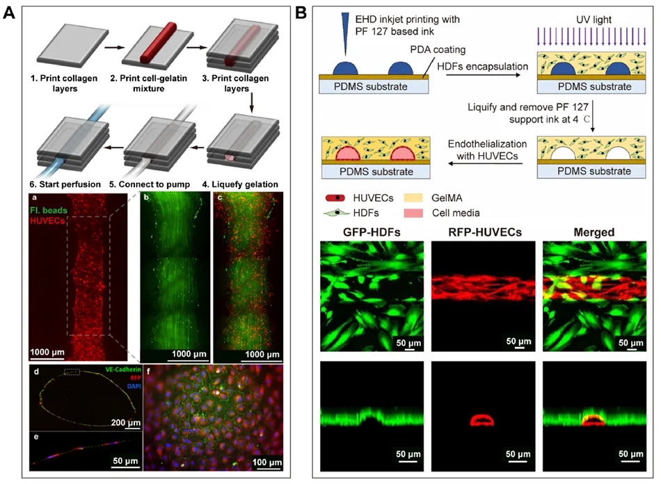 通过使用细胞-明胶混合物和逐层喷墨打印方法,研究者们成功构建了具有特定尺寸和功能的血管通道。这些通道不仅在微观尺度上模拟了真实血管的形态,而且在内表面形成了人脐静脉内皮细胞(HUVECs)的单层,展现了对血浆蛋白和右旋糖酐分子的屏障功能。此外,通过电液滴喷射(EHD)喷墨生物打印技术,实现了微血管结构的高分辨率制造,这些结构的尺寸可低至30微米。在这一过程中,使用了Pluronic F127作为牺牲模板,以及含有人真皮成纤维细胞(HDFs)的GelMA作为永久基质,通过去除牺牲模板实现了内皮化,形成了具有功能性的内皮层。