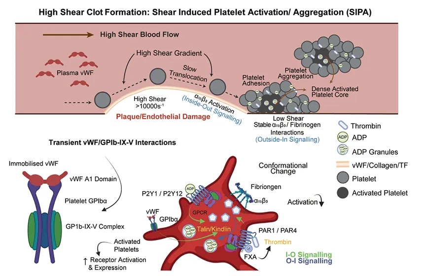 剪切力诱导的血小板激活/聚集(SIPA)是血小板对血流剪切力的生物学响应,通常发生在血液流经狭窄处或高剪切率条件下。这一过程涉及血管性血友病因子(vWF)的释放、血小板形态和受体结合的变化、血小板聚集以及细胞内信号通路的激活。在高剪切力下,血小板GPIb与vWF之间的相互作用启动了血小板的粘附和激活。激活的血小板释放多种激动剂,如腺苷二磷酸(ADP)和血栓素A2(TxA2),这些激动剂进一步放大血小板聚集和血栓形成。
