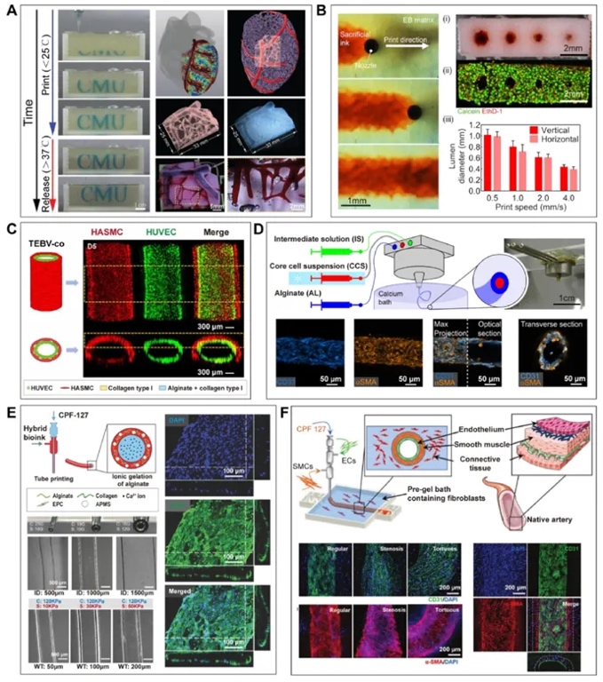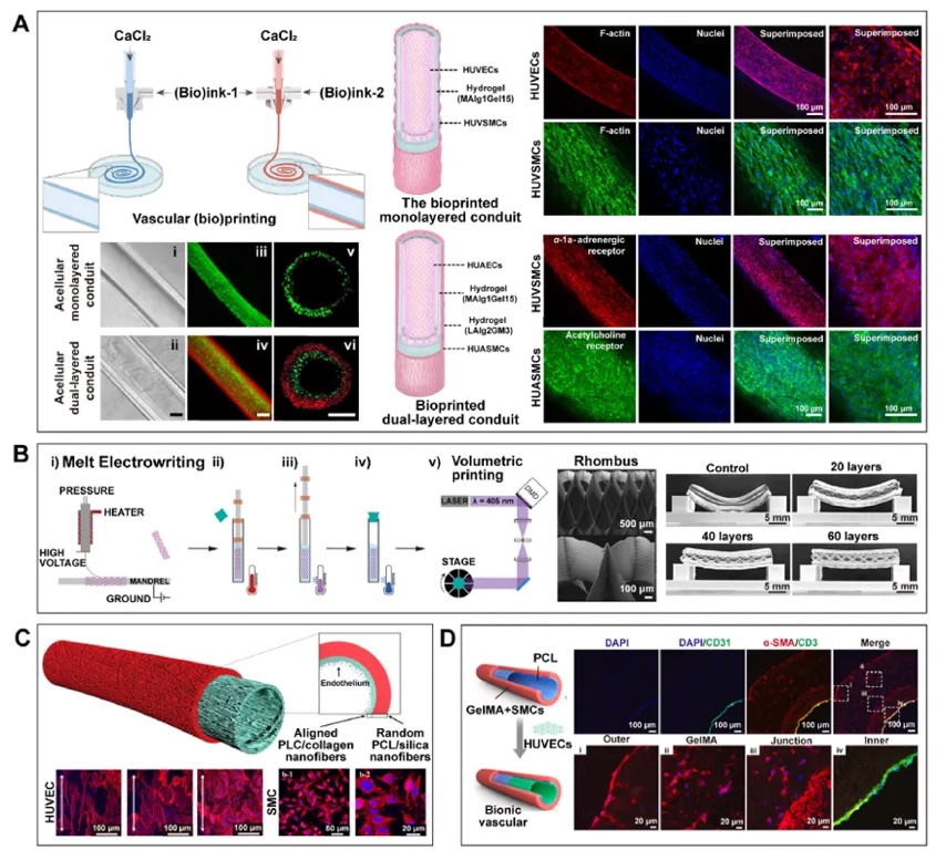 使用挤出式生物打印技术制造血管结构,其中包括利用自由形态可逆嵌入水凝胶(FRESH)技术在心脏模型中构建多尺度血管网络,以及通过调整打印速度使用SWIFT方法制造不同直径的管状结构。研究者们还通过共轴挤出技术,将人脐静脉内皮细胞(HUVECs)和人动脉平滑肌细胞(HASMCs)分别包裹在不同的生物墨水中,然后通过共轴喷嘴挤出,形成了具有模拟体内细胞排列的双层空心纤维。此外,还有研究利用海藻酸盐作为外层材料,核心细胞悬浮液作为内层,通过平滑肌细胞的定向自组装形成具有双层结构的血管模型。