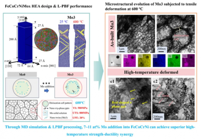 相关成果以“Multiscale plastic deformation in additively manufactured FeCoCrNiMox high-entropy alloys to achieve strength–ductility synergy at elevated temperatures”为题刊登在International Journal of Plasticity上。