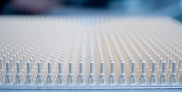 图5: 3D打印套管在清洗、 拆除和烧结之前置于打印 平台上的状态。(图⽚来源: 博世先进陶瓷)