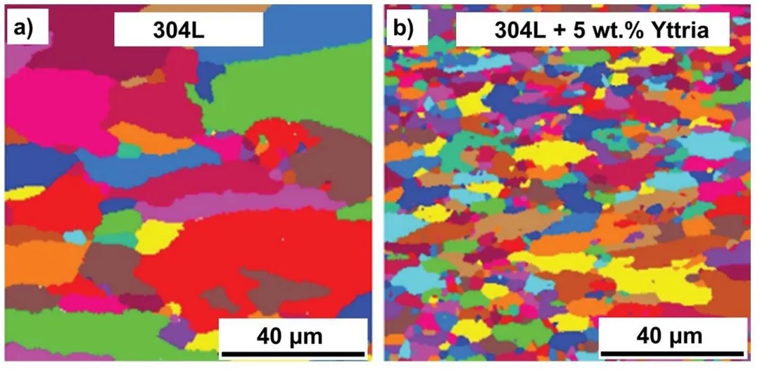 图5.304L不锈钢的EBSD图显示:(a)未添加钇的柱状晶粒;(b)添加5wt%钇的等轴晶粒。