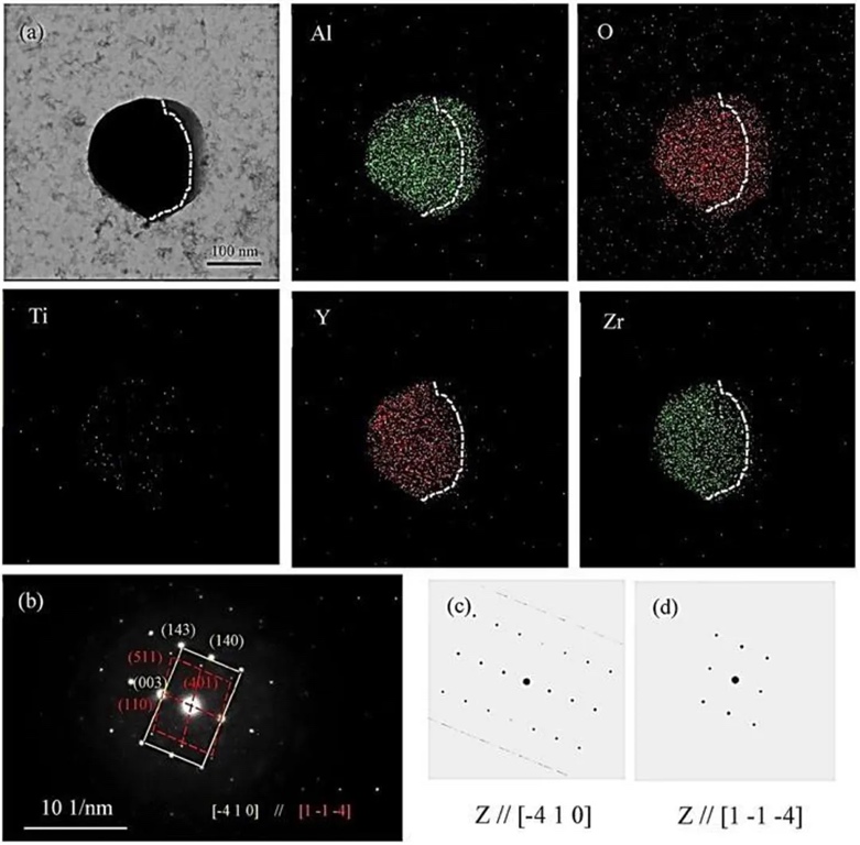 图6.(a)STEM图像显示粗附属氧化物颗粒及其相应的EDS图;(b)粗附属氧化物的SAD图;(c)和(d)显示模拟衍射点,突出显示沿[-4 1 0]方向的Y4Zr3O12氧化物和沿[-4 1 0]方向的Al2O3氧化物。