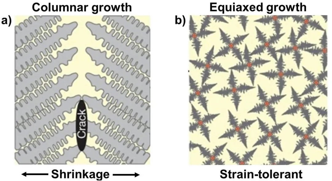 图3.金属凝固形态示意图(a)柱状生长的树状晶粒因凝固收缩而出现裂纹;(b)纳米颗粒的加入促进了等轴晶粒的生长,从而适应了凝固应变。