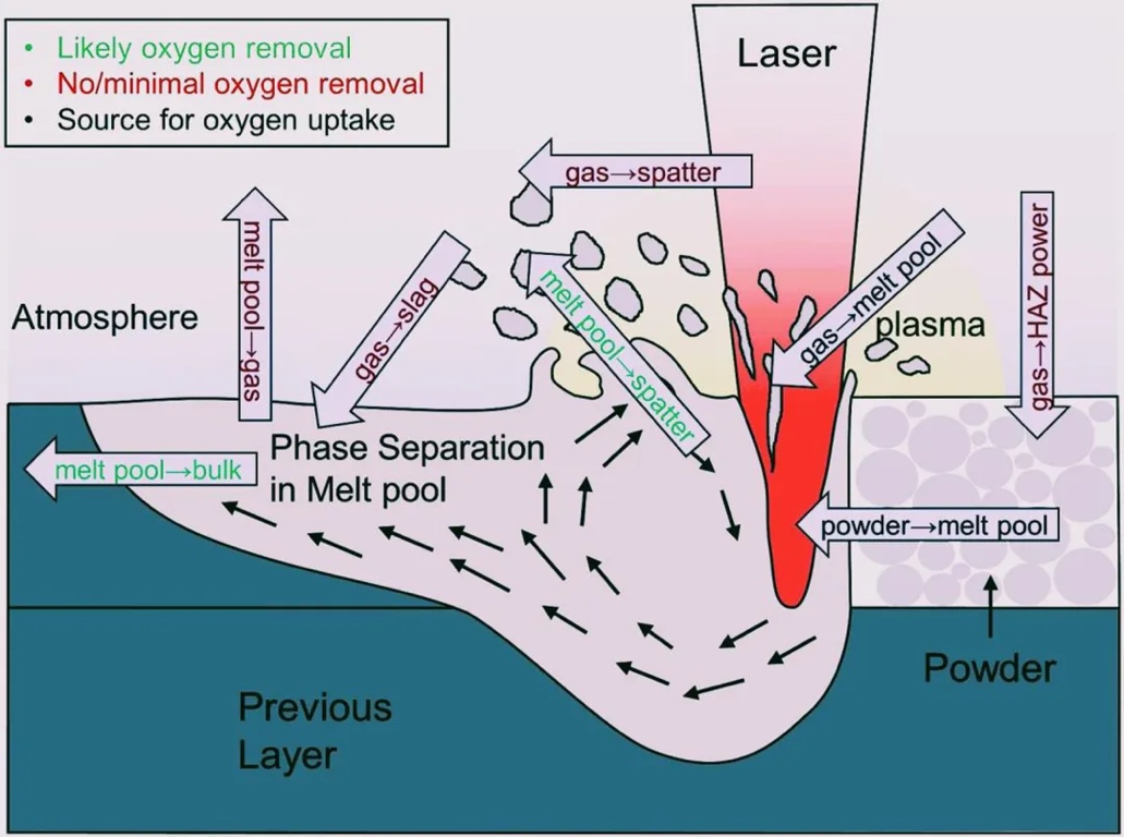 图2.激光、液态熔池和气体相互作用过程中熔池吸氧和除氧的路径示意图。