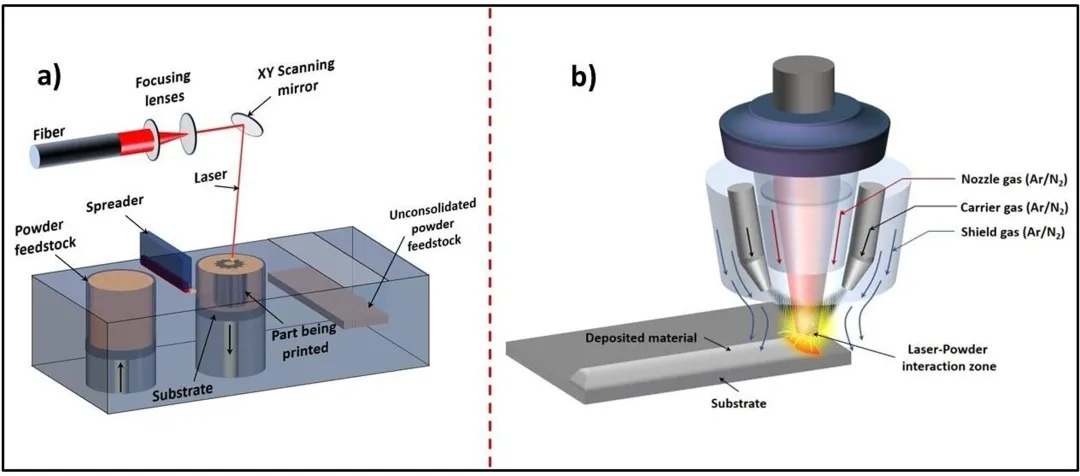 图1.(a)L-PBF;(b)L-DED的示意图。