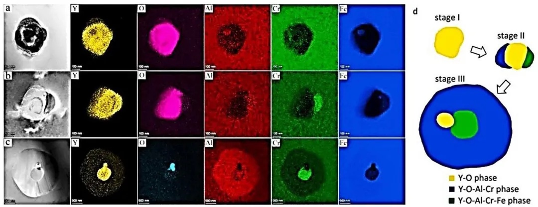 图7.经AM处理的FeCrAlY-0 wt.%TiC的TEM分析。(a)-(c)颗粒和相应的EDS分析;(d)核壳粒子形成过程示意图。