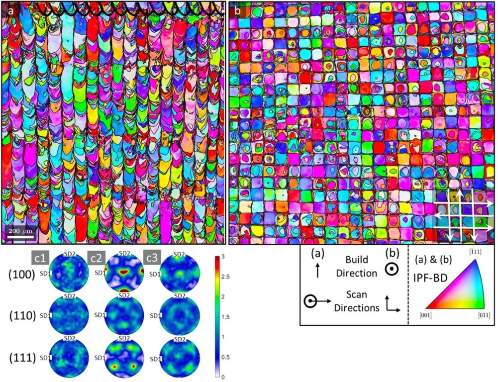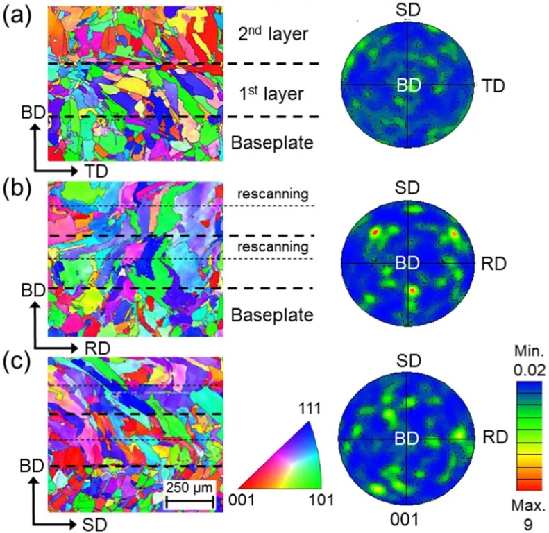 图10.(a)横向打印的316L样品和(b, c)重新扫描后的316L样品沿成型方向(BD)的EBSD 逆极图和纹理图,(b)代表重新扫描方向(RD)的样品,(c)代表扫描方向(SD)的样品。