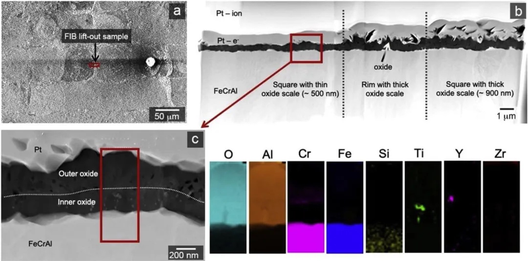 图11.L-DED制作的铁铬铝样品的高角度环形暗场扫描透射电子显微镜(HAADF STEM)显微图,显示向外和向内生长的氧化物。