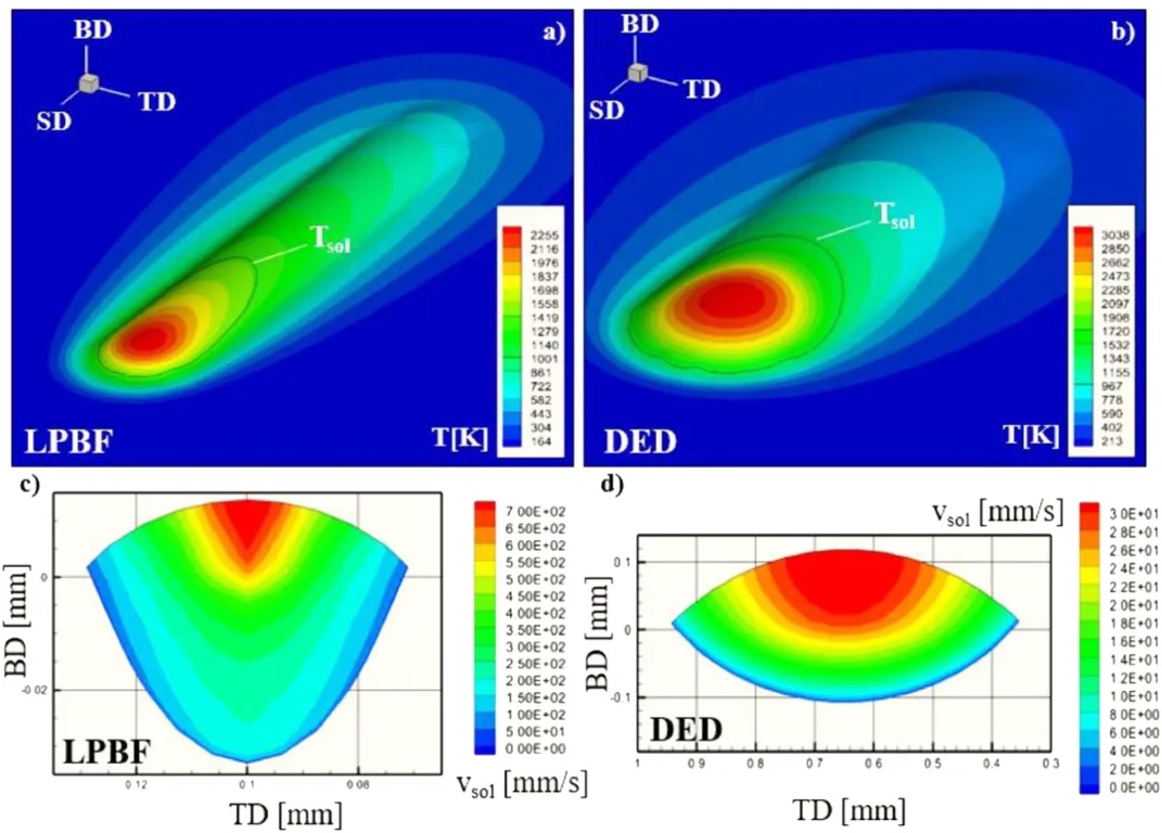 图8.基于多物理场的L-PBF和DED过程计算分析。(a)-(d)熔池凝固的有限元模拟,显示凝固温度(Tsol)和凝固速率(Vsol)的差异。