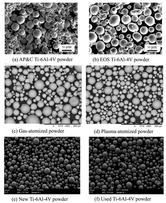 图2.(a)AP&C Ti-6Al-4V粉末和(b)EOS Ti-6Al-4V粉末,(c)气体雾化粉末和(d)等离子体雾化粉末,以及(e)新Ti-6Al-4V粉末和(f)旧Ti-6Al-4V粉末的扫描电镜显微图。