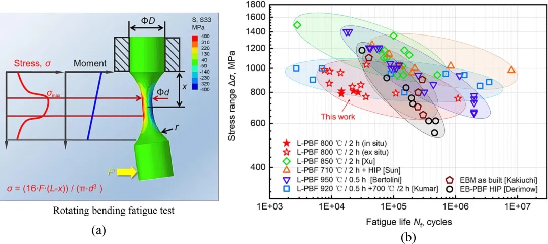 图4.(a)旋转弯曲疲劳微型试样的载荷示意图和应力分布。(b)原位/原位RBF小型试样的疲劳数据与经过各种后热处理的AM合金(包括L-PBF、电子束粉末床熔融(PBF-EB)和电子束熔化(EBM))的疲劳数据进行比较。