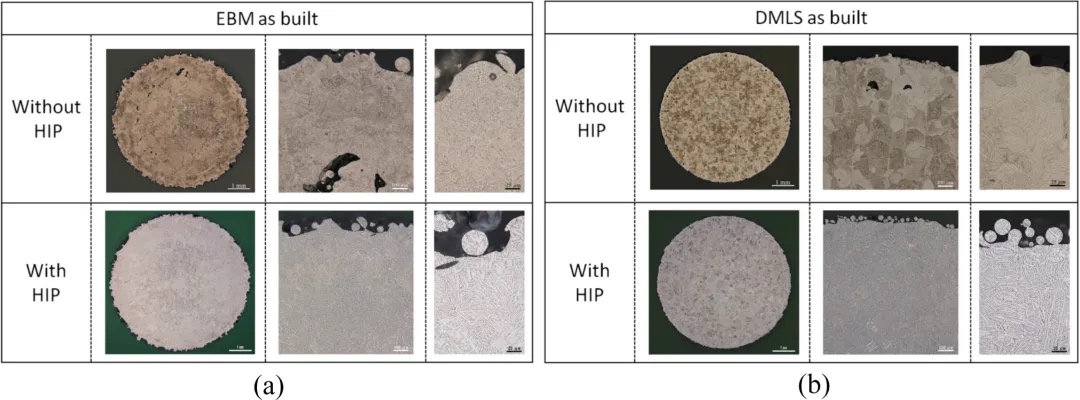 图5.(a)无HIP和有HIP的EBMed Ti-6Al-4V显微结构。 (b)无HIP和有HIP的DMLSed Ti-6Al-4V显微结构。