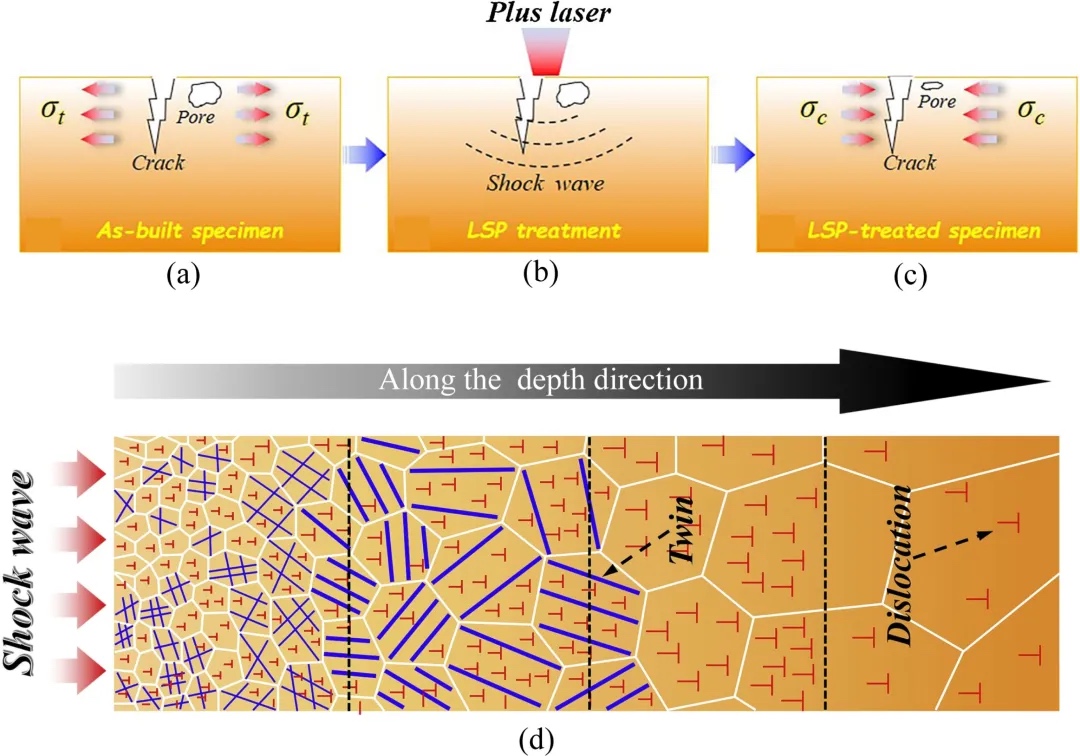 图7.LDED制备的试样在LSP期间的冶金缺陷和残余应力演变示意图。(d)沿深度方向的整个微观结构示意图。