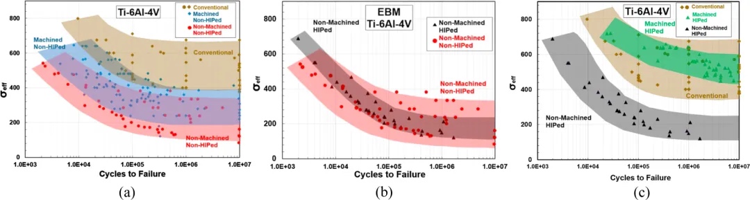 图8.(a)机加工试样与非机加工试样(非HIP材料)的疲劳特性对比。(b)经HIP处理的部件与表面未经机加工的非HIP处理部件的疲劳特性对比。(c)经机加工表面的HIP材料与加工表面和参考材料的疲劳性能比较。